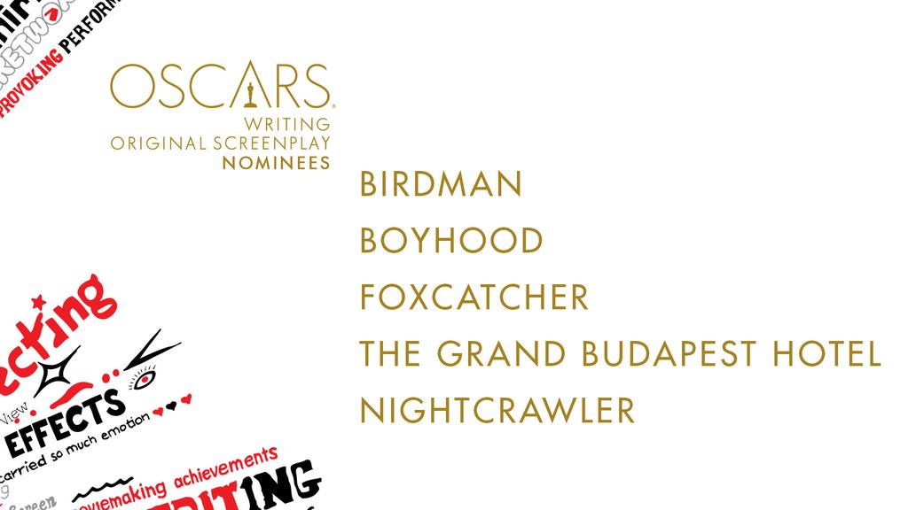 Лучший оригинальный сценарий: Бёрдмэн, Отрочество, Охотник на лис, Отель Гранд Будапешт, Стрингер