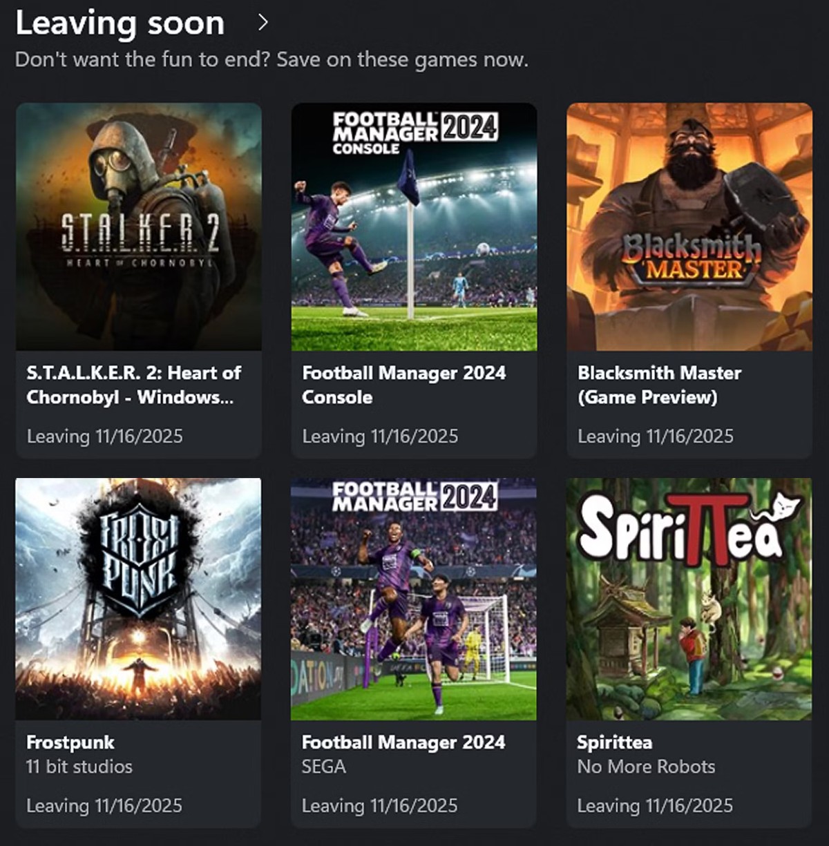 В список на удаление также вошли Football Manager 2024, Frostpunk, Spirittea, S.T.A.L.K.E.R. 2: Heart of Chornobyl и Blacksmith Master. Предыдущая волна удалений затронула Xbox Game Pass 31 октября, когда сервис покинули Return to Monkey Island, Metal Slug Tactics и Jusant. Официальных анонсов о следующей ротации каталога пока не было, однако раздел "Скоро покинут сервис" в приложении Xbox уже обновился с перечнем готовящихся к удалению тайтлов.