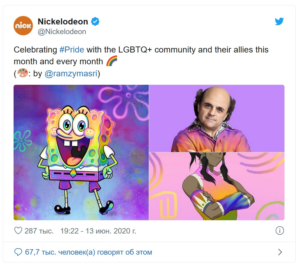 Телеканал Nickelodeon раскрыл имена трех своих канонических персонажей, которые являются частью ЛГБТ-сообщества, в их число попал и главный герой известного мультсериала «Губка Боб квадратные штаны». Об этом студия рассказала в своем Twitter.