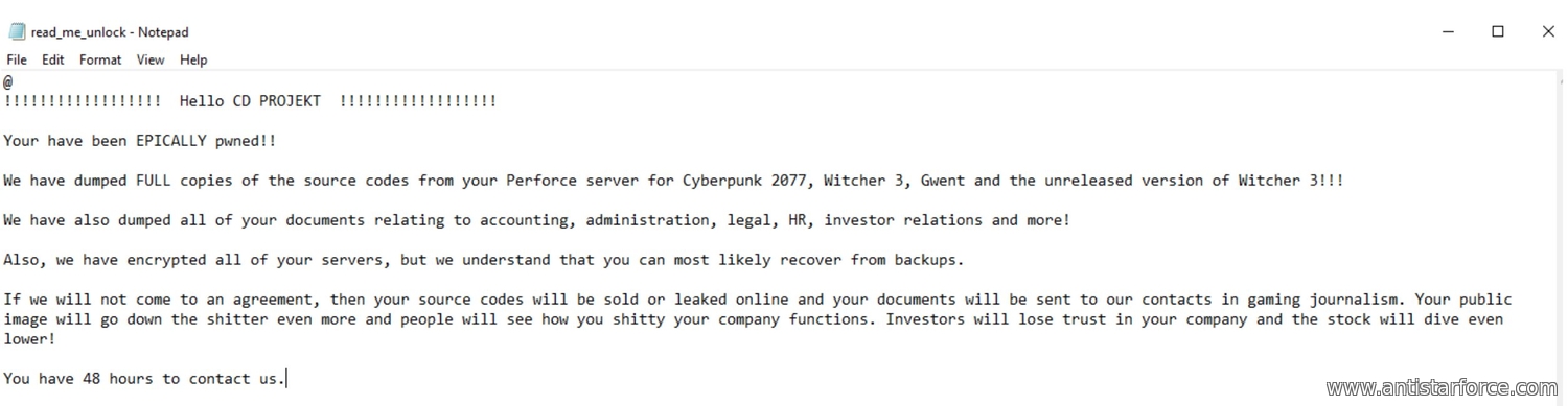 «Привет CD Projekt! Вас эпично поимели!! Мы скачали весь исходный код «Ведьмака 3», Cyberpunk 2077, «Гвинта» и не выпущенной версии «Ведьмака 3»!!! Мы также скачали все документы, которые касаются финансового учета, администрирования, юридического отдела, HR, отношений с инвесторами и другие! Еще мы зашифровали ваши серверы, но понимаем, что вы наверняка сможете восстановить их через бэкап.